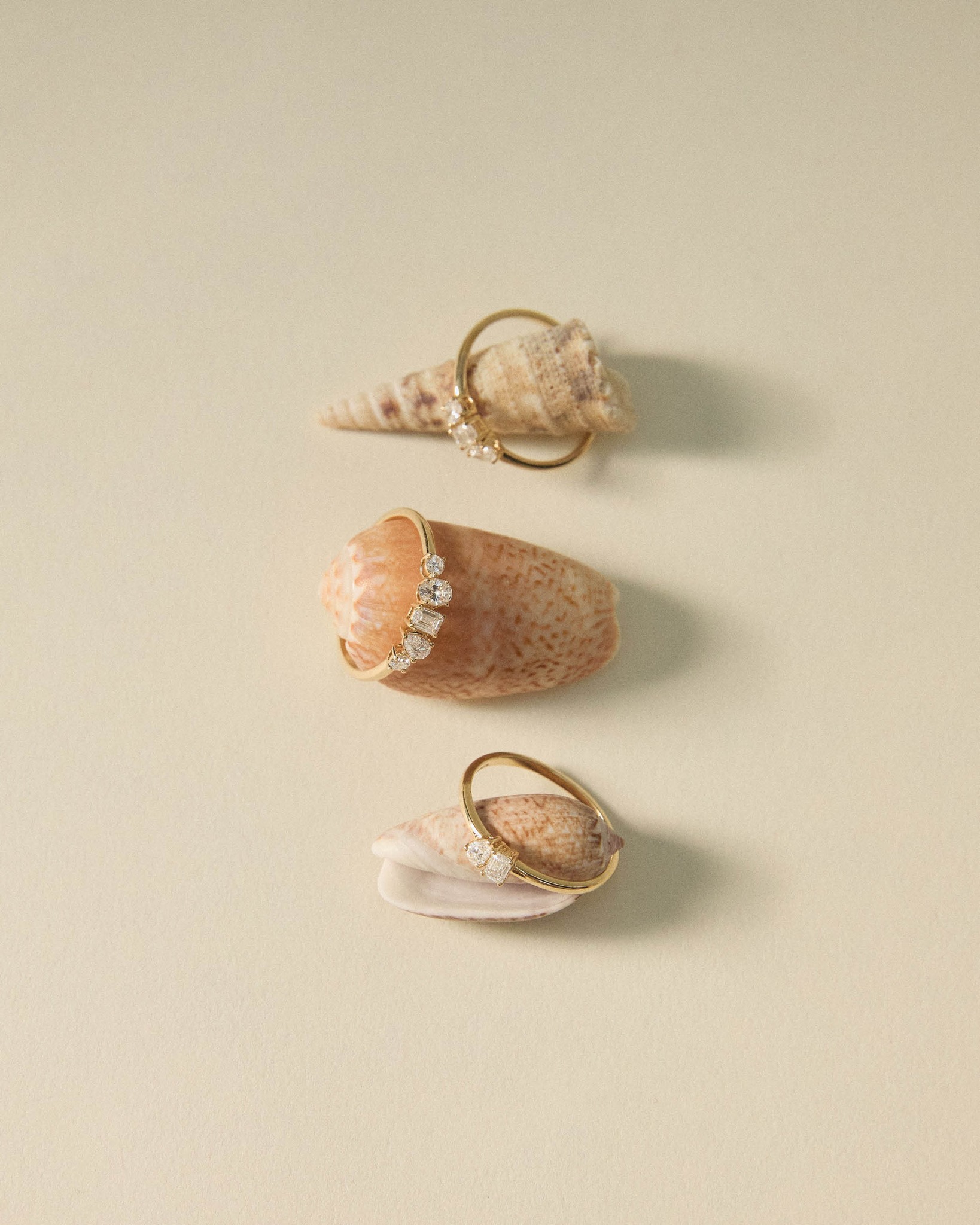 Dieses wunderschöne Triset von Breuning gewann den "Trauring 2025" Award des Brautmagazins. 21 Diamanten zieren den zarten Memoirering, der sich wunderbar mit dem Profilring aus 14-karätigem Gelbgold kombinieren lässt.
